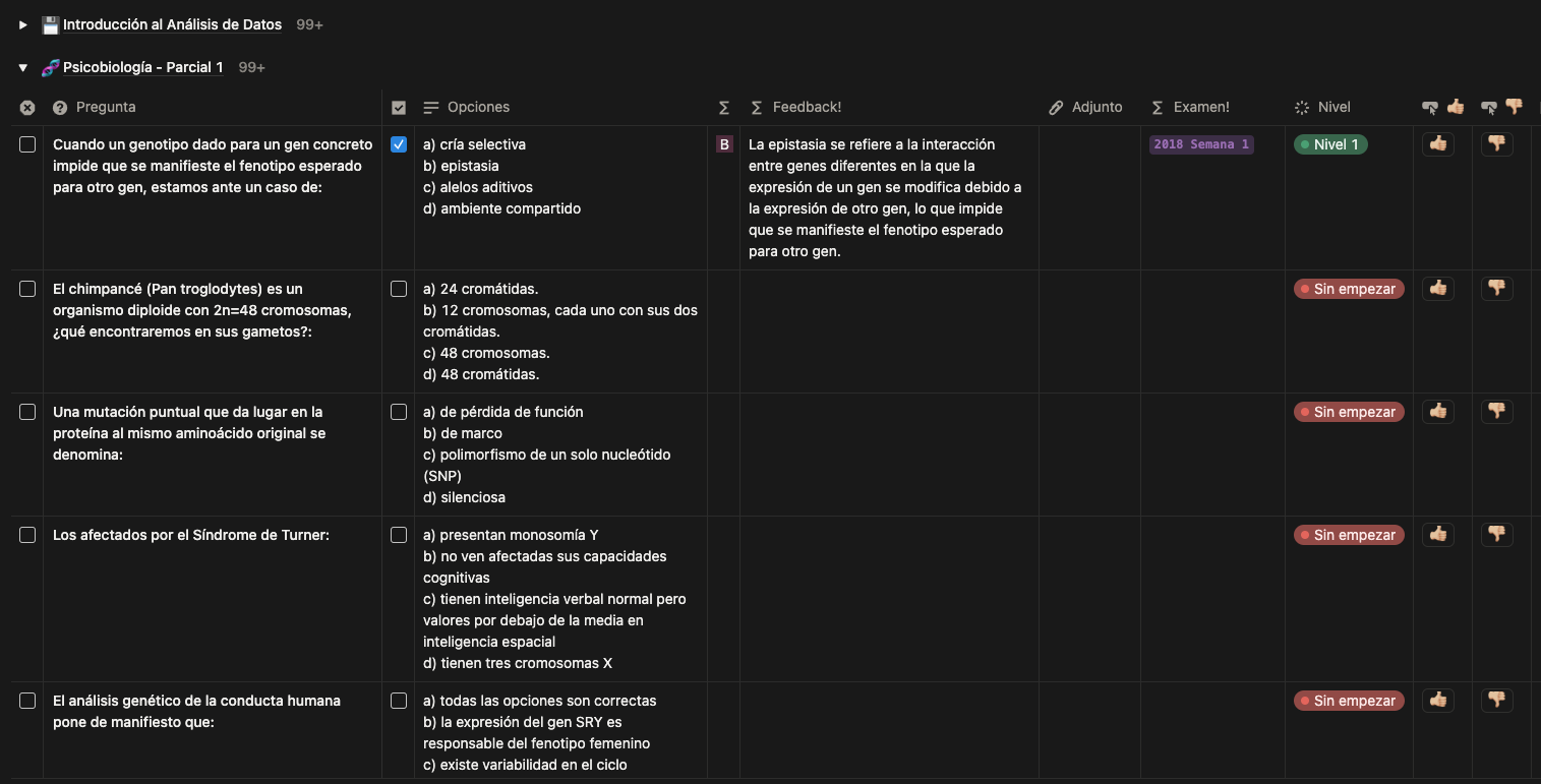 - Apuntes: espacio para tomar notas directamente en Notion, vincularlas a preguntas o crear nuevas desde el propio panel.